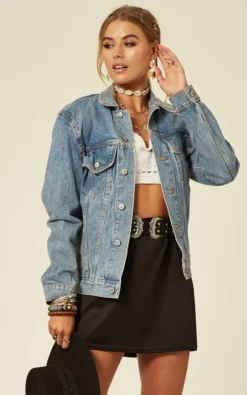 Denim Jacket With Embroidery On Back In Mid Wash