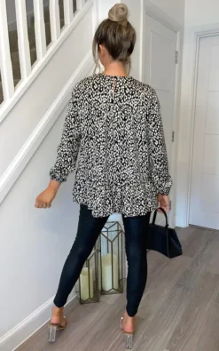 Shop our Black And White Printed Long Sleeve Smock Top! Featuring a beautiful soft satin printed fabric, smocked silhouette, long sleeves with elasticated cuffs and a key hole button back. Style with your favourite pair of jeans and trainers, or glam it up with a pair of wide leg black trousers and strappy heels.