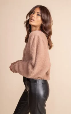 Time to get all comfy and cosy. Our Bambino Cardigan in Mocha is a great thrown on over a tee and jeans, or wear buttoned up on its own. Crafted from fluffy feather-knit fabric, this oversized cardi is hip length and perfect for colder months. Detailed with full length balloon sleeves and a 3 gold button fastening. Hand Wash Only.