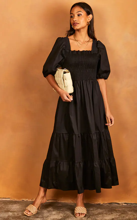 Black Bella floaty midi dress with Balloon Sleeves. Fresh and breezy the Bella dress is the most romantic dress around. Featuring shirred details and hugging neckline, this maxi can be worn off the shoulder or with the cute balloon sleeves up. Team with strappy sandals for a lovely garden party look or heels for summertime eve’.