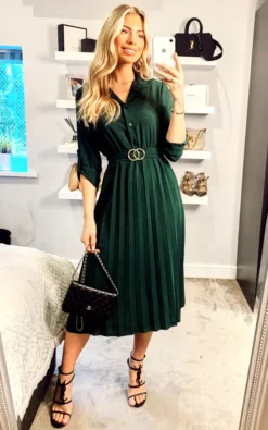 Imagined with a classic shirt shape, this midi Green dress from Mela offers a subtle formal update. Adding a touch of sophistication with the gold-tone belt, it features gentle pleats running from the waist to the hemline. The classic shirting collar is maintained for maximum impact.