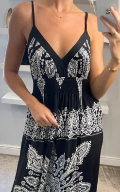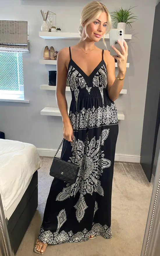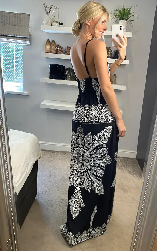 No vacation closet is complete without a bold printed a-line maxi dress. With a v-neck, cap sleeves and a straight full length skirt. Pair with flat sandals and a denim jacket for a versatile daytime look.