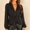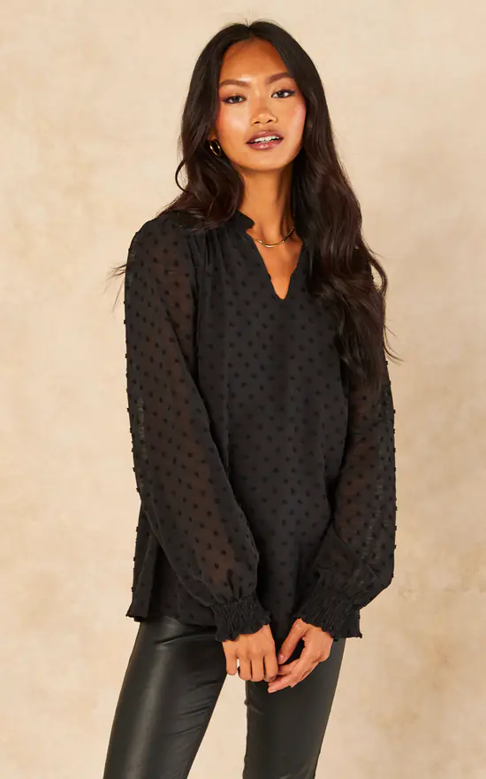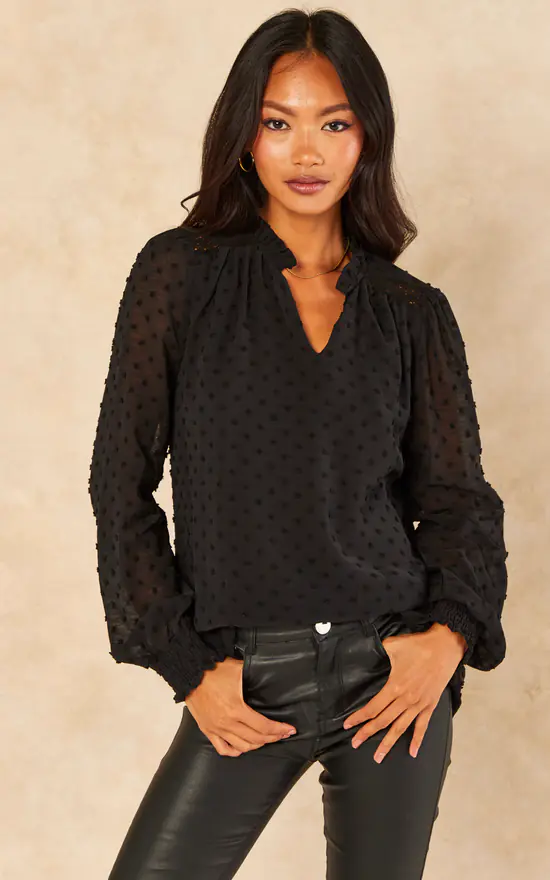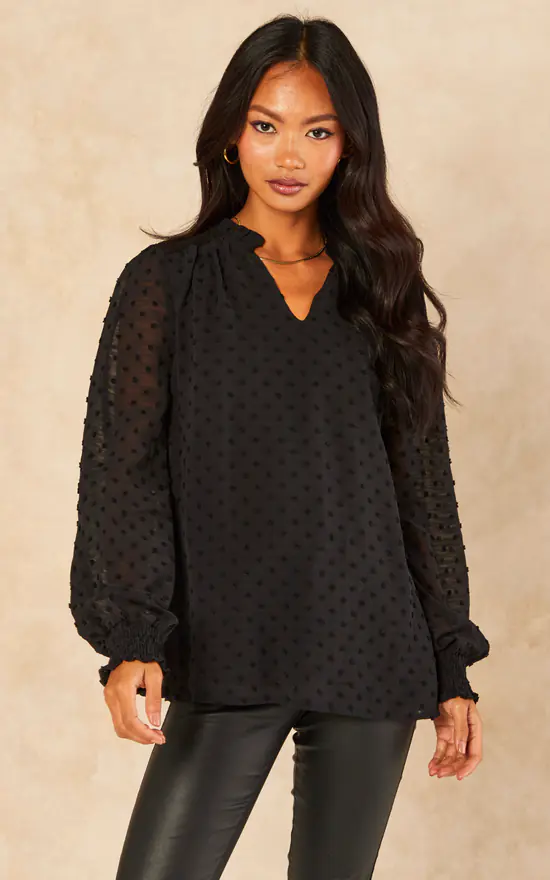 You can add a feminine touch to a smart look with this stunning long-sleeve blouse in a black dobby chiffon material! Perfectly lined, it has sheer sleeves with shirred cuffs and a unique frilly henley neckline, which can also create a deep V-neckline! We’ve created this eye-catching essential for all-important versatility.
