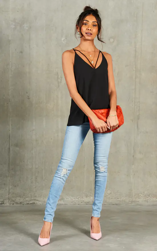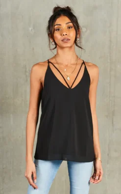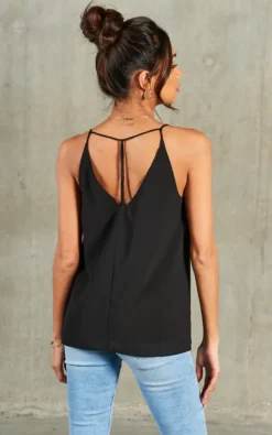 This summer, give yourself a cool style with this plain strappy black cami top with a plunge neck. For a perfect look, pair it with slim-fitting jeans and sporty sneakers. And with this neck design, you’ll simply stand out!
