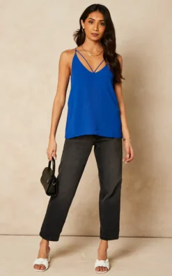 This summer, give yourself a cool style with this plain strappy blue cami top with a plunge neck. For a perfect look, pair it with slim-fitting jeans and sporty sneakers. And with this neck design, you’ll simply stand out!