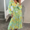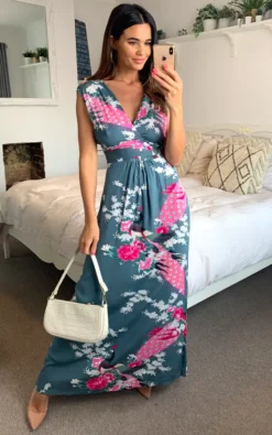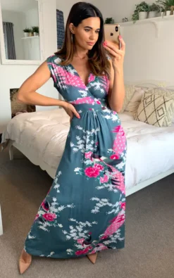 Lovely charcoal grey floral and peacock print maxi dress with deep V front and back wrap detail. Empire line nipped in waist and back shirring elastic detail give a very flattering fit. Great must have dress for the season.