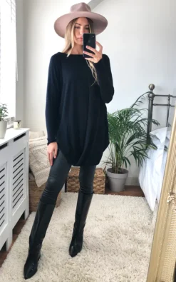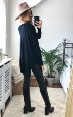 Soft, high quality italian knitwear made of sustainable viscose and microfibre. The knit features oversize longline design, long sleeves, boat neckline and sassy twist at the front. Available in black, beige and grey.
