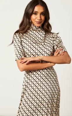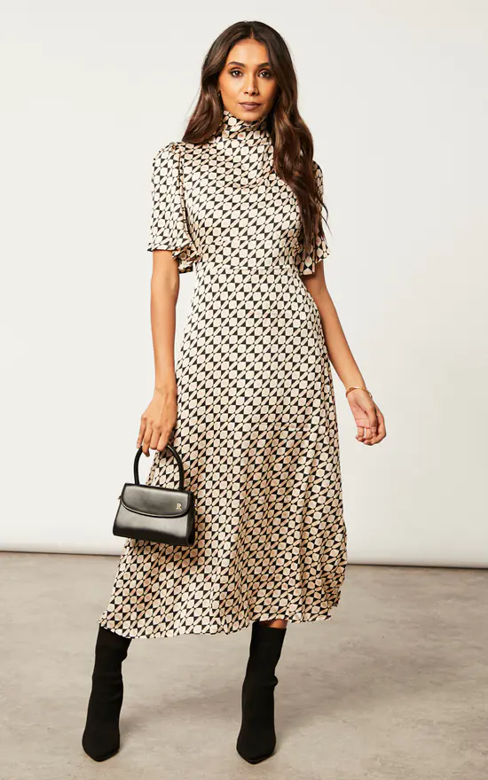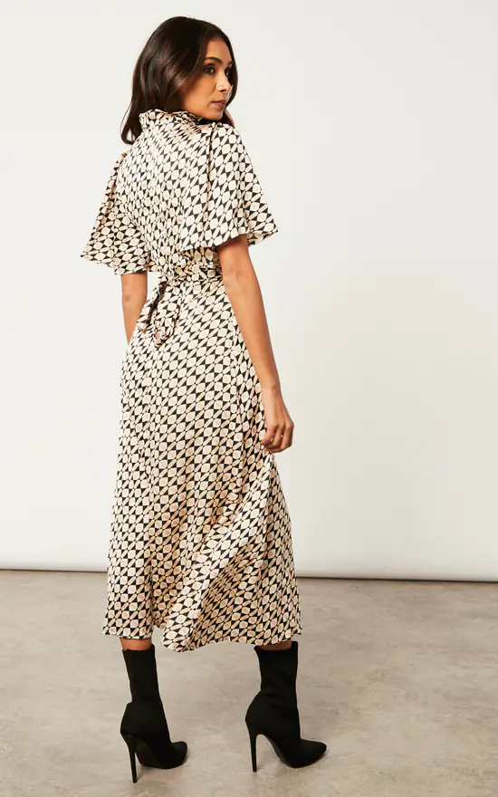 Want a dress that is suitable for the workplace and then later on when having casual drinks? Look no further than the Cowl Neck Midi Dress with Angel Sleeve. With a waist belt, back zip, a geo print and and a playful cowl neck, this dress has all the elements you need! Match with heeled shoes.