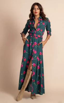 Meet the maxi shirt dress that works from the office and beyond. Featuring ¾ length sleeves with tie-cuffs and a flattering waist belt with a retro square buckle. Complete with a fully-buttoned front that can be adjusted to suit your style. Hand-drawn poppies print.