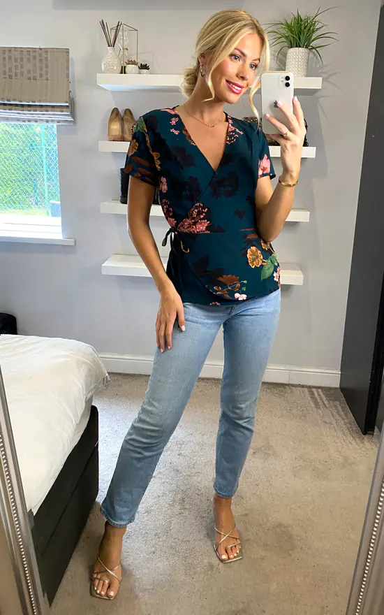 Pick a flattering wrap front top to add to your closet, with this floral blouse. With a v-neck, wrap front, short sleeves and a peplum shape sitting at the hips. Pair with a faux leather pencil skirt and heels for a chic office look or dress down for date night with jeans and strappy sandals.