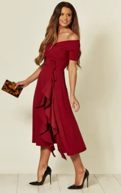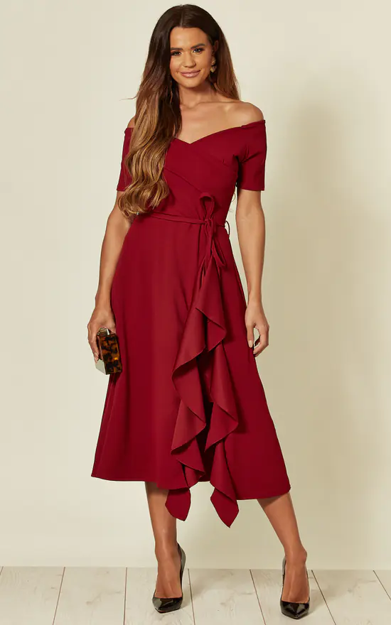 Bardot off shoulder frill midi dress from Feverfish ,this design has a proportion balancing off shoulder neckline with a asymmetric frill detail skirt,also featuring a tie belt at the waist this chic design is perfect for a formal occasion and is made in stretch crepe fabric.