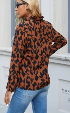 Frill Detail High Neck Top In Camel Brown & Black Leopard Animal Print