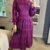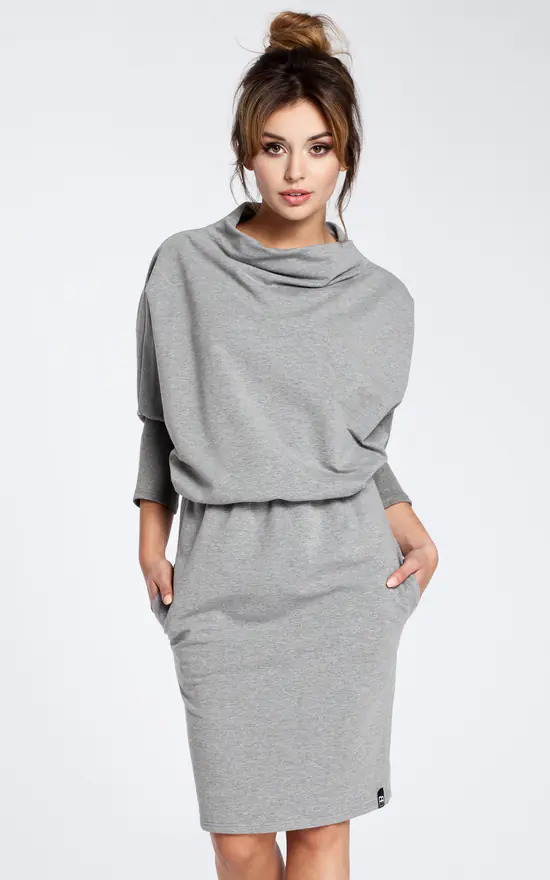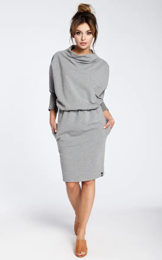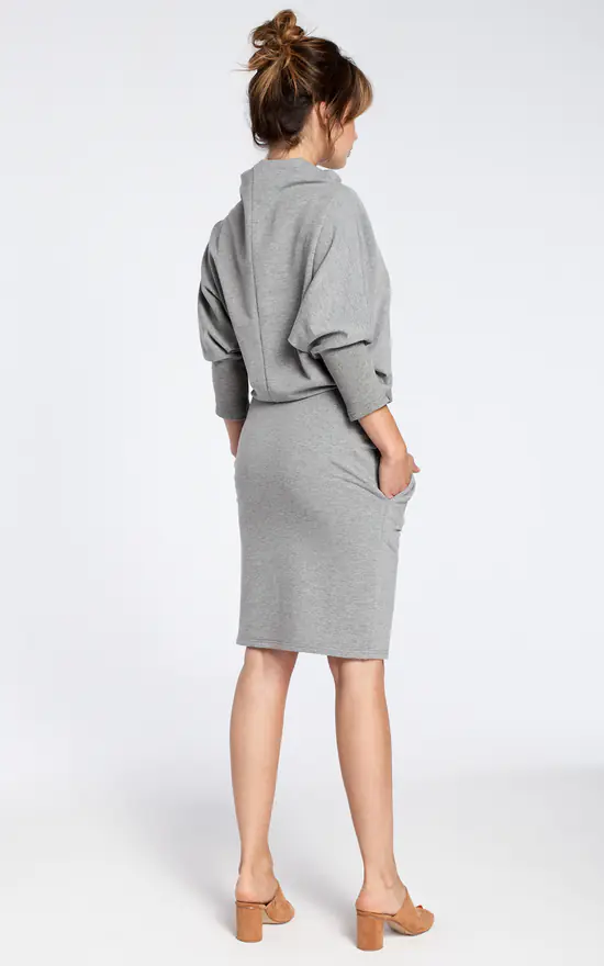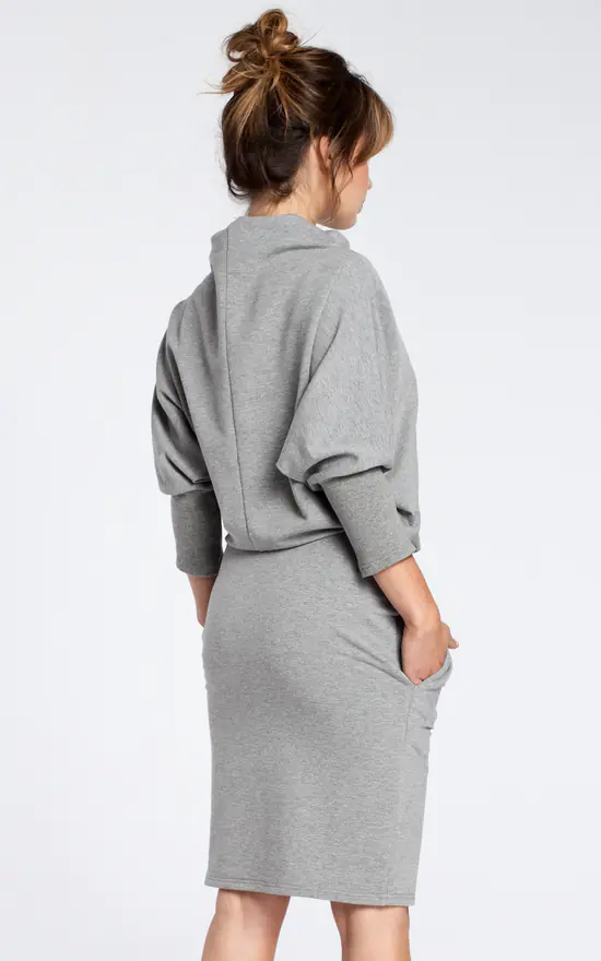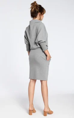 Practical and comfortable, an ideal day dress in grey with a knee length pencil skirt, elasticized waist and loose top with ribbed trim finished kimono sleeves. Stretchy cotton blend