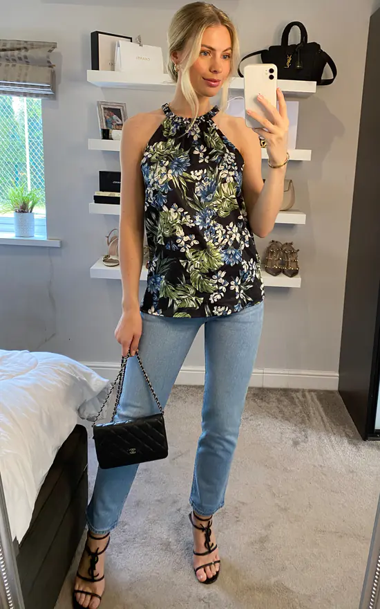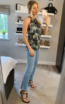 The Halter Neck Floral Printed Top in Black by Angeleye is a summer essential! A gorgeous printed fabric, to be paired with a pair of jeans sandals and clutch when you’re heading out for drinks, or paired with black leather skirt and heels for days at work!