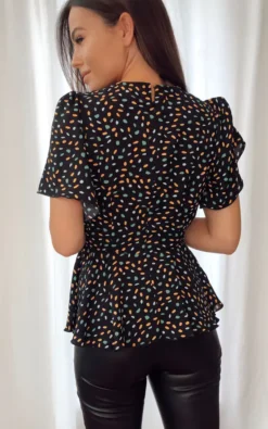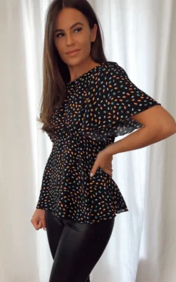 This is our brand new peplum top in beautiful multi spot print . Featuring a back zip and bell sleeve detailing. Be talk of the town in this stunning top.. Dress it up with leather jeans and heals or down with shorts and trainers.. Measurements are all in cm,on the half except length, and are all based on an average UK size 8 sample: Bust: 41.5cm Waist: 35.5cm Style Code: SI6598-E-MULTI