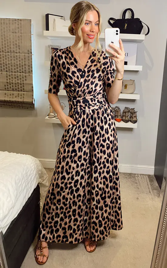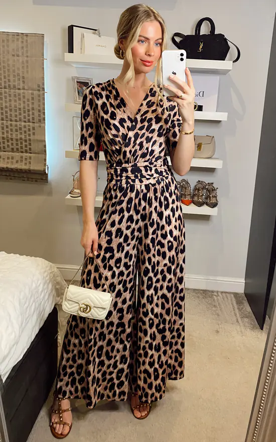 Exclusively by Jolie Moi. Embrace the print of-the-moment with this jumpsuit from Jolie Moi. Made from soft and stretchy jersey for long-lasting comfort, the cross-over V-neck runs into a ruched elasticated waistband before flowing down into wide-leg trousers. Completed with two side pockets and partially lined. Pair with your favorite slider sandals or trainers and layer over a denim jacket.