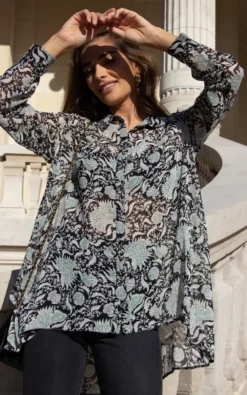 Gorgeous printed blouse with a lurex stripe running through it, and gold buttons. Perfect with a pair of leather jeans, we love the longer length and hi lo hem making it super flattering for all shapes, a definite wardrobe staple.