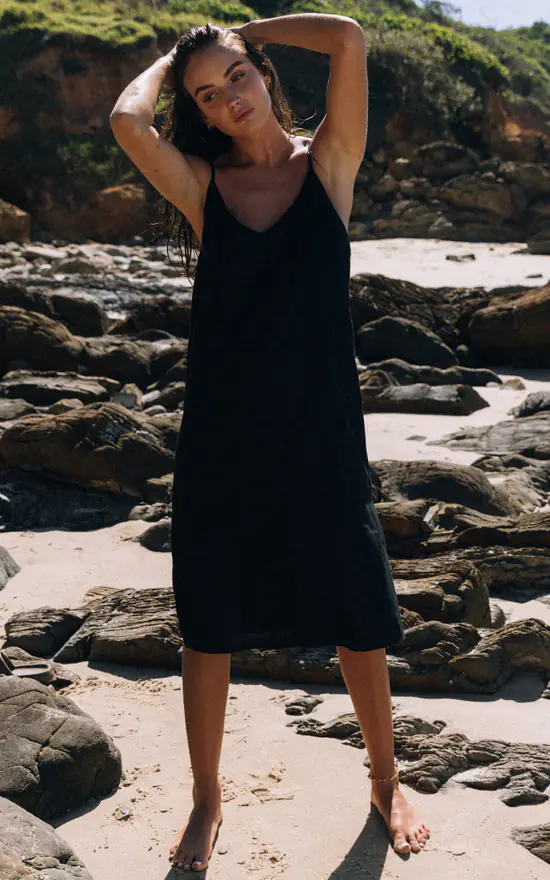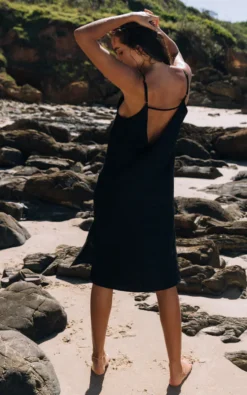 Linen Midi Slip Dress In Black