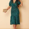 Long Sleeve Wrap Midi A-Shape dress in Dark Green Petrol. Has wrap detailing at the back.
