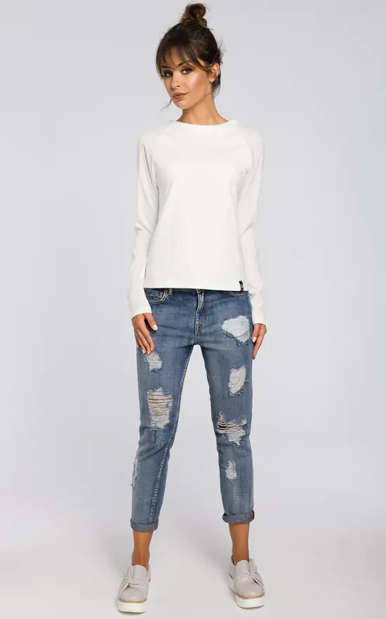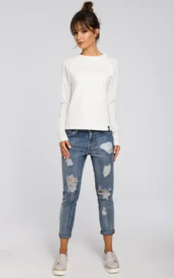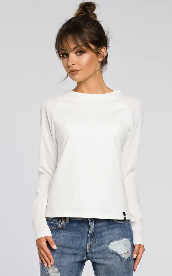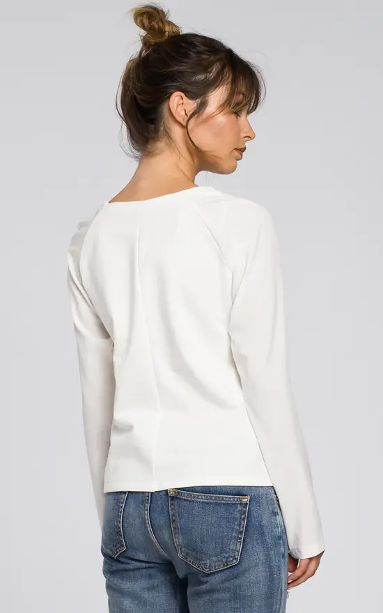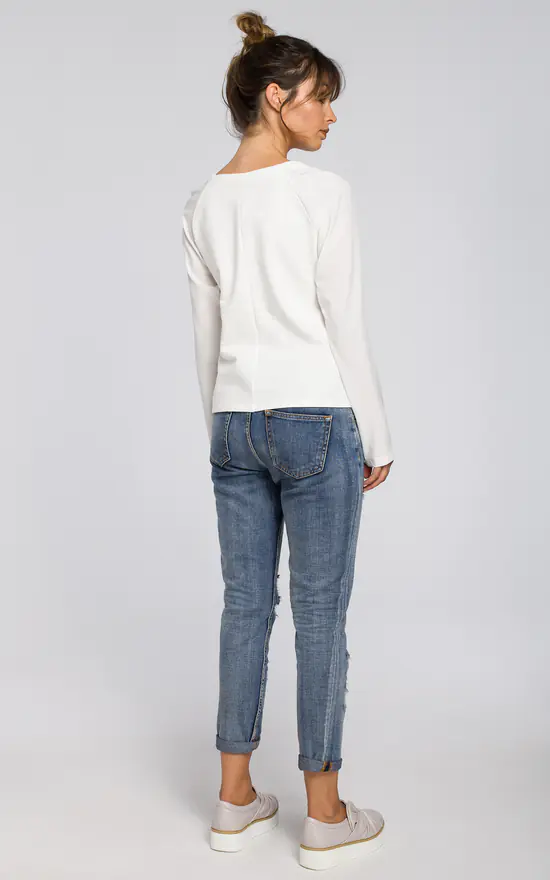 This versatile blouse cut from two fabrics with woven sleeves and knit bodice will go well with your favorite jeans and a pencil skirt.