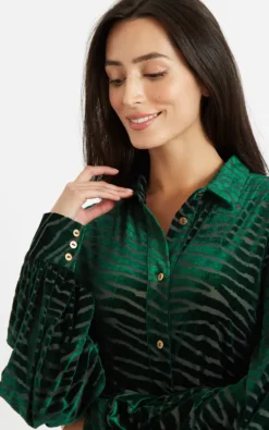 Your favourite Byron shirt is reimagined . Crafted in a zebra design devore velvet, it has to be my favourite Byron yet. Paired here with the Aubin Flower but will elevate any outfit. Featuring wide sleeves with deep cuffs and delicate solid brass buttons.