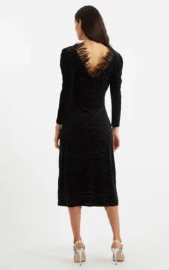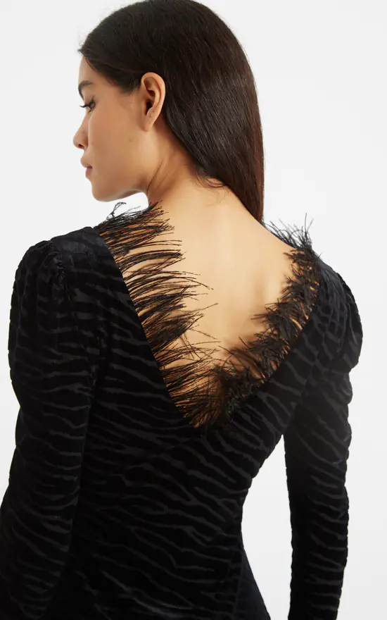 Krystel is crafted in a soft velvet devore zebra design jersey and features a low (bra friendly) V back, with a neckline bedecked with feathers. Adding that Hollywood glamour to any occasion.