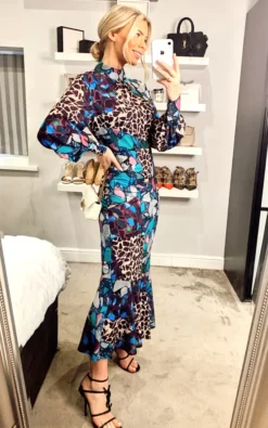 A gorgeous Multi Print Long Chiffon High Neck Tea Dress by Angeleye that will glamour your wardrobe. Features wide cuffs and gold button details throughout, a high neck collar, cuffs, crafted from the most stunning multi floral print in gorgeous purple, green hues. Match with a leather jacket and a pair of chunky black boots to complete the look.
