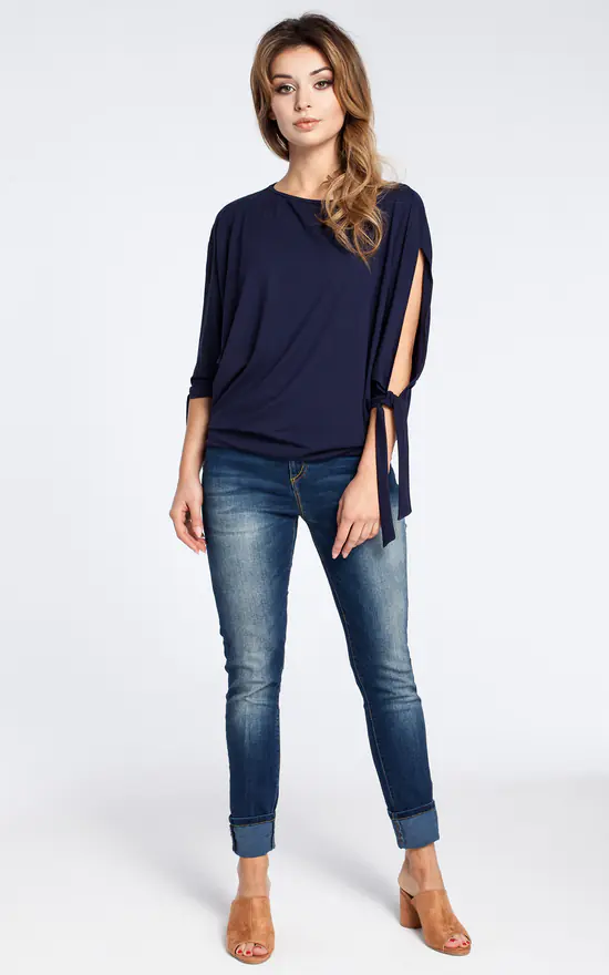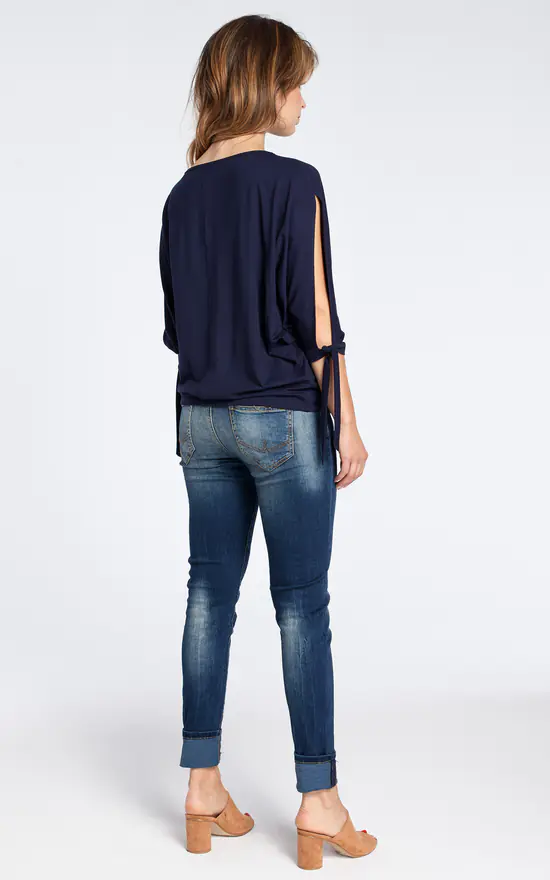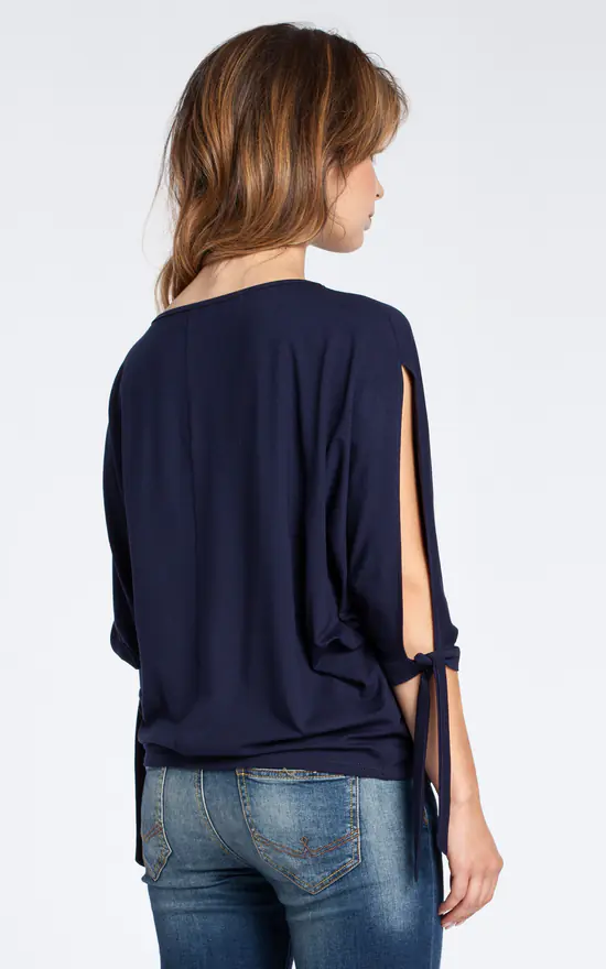 Soft viscose fabric and oversized fit make this navy batwing blouse a must-have for your everyday comfort. Open shoulder and tie short kimono sleeve add the fashionable look.