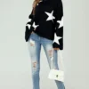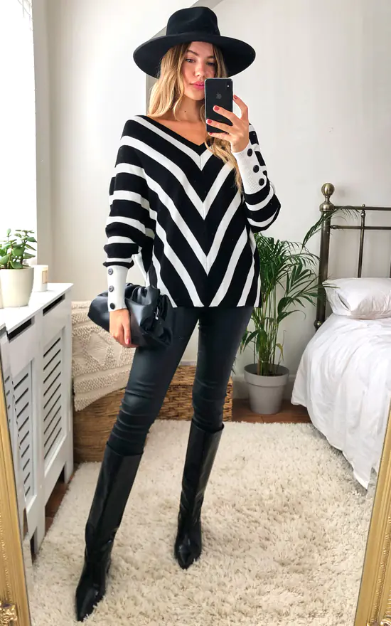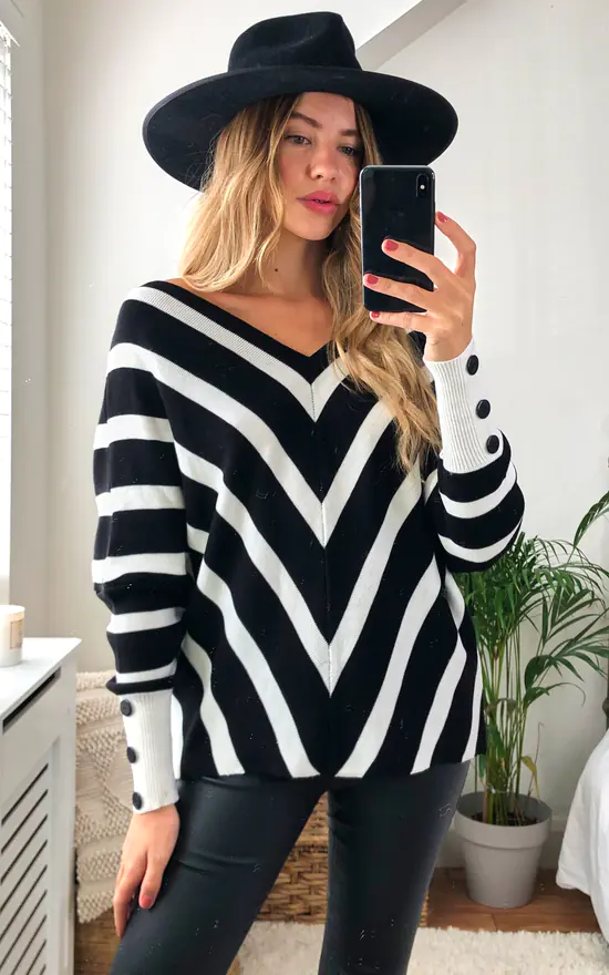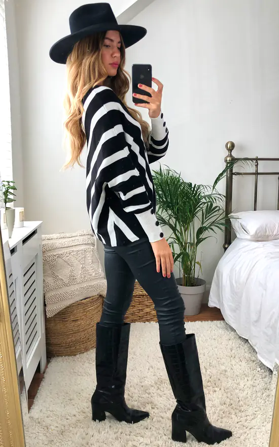 Our Striped Long Sleeved Knitted Sweater with big buttons on the sleeves is the best partner for your skinny jeans or leather leggings this Autumn/Winter. Style it off the shoulder for a relaxed yet sexy look. The cozy and soft fabric will keep you comfy day and night.