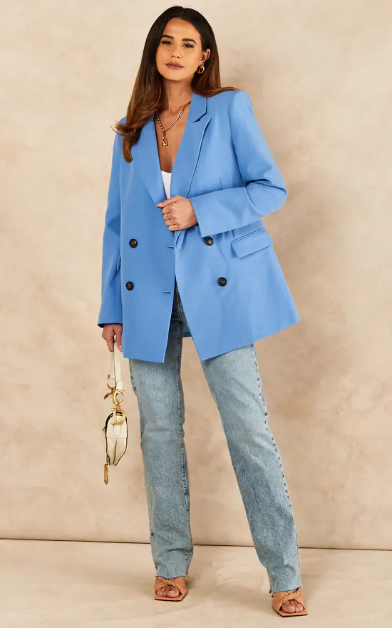 Oversized Double Breased Longline Blazer/Jacket in Light Blue colour with 4 buttons and Peak lapel. Decorated with 2 side envelope pockets.