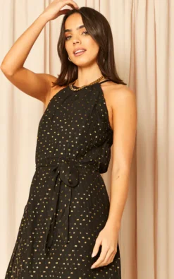 A pretty print pleated dress for you to wear on special occasions. This dress has a mesh top layer, a waist belt to accentuate your figure, a flirty open back, and a halter neckline that will make you look even more elegant. You will not wrong styling dress with high heel shoes and a mini bag.