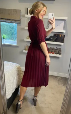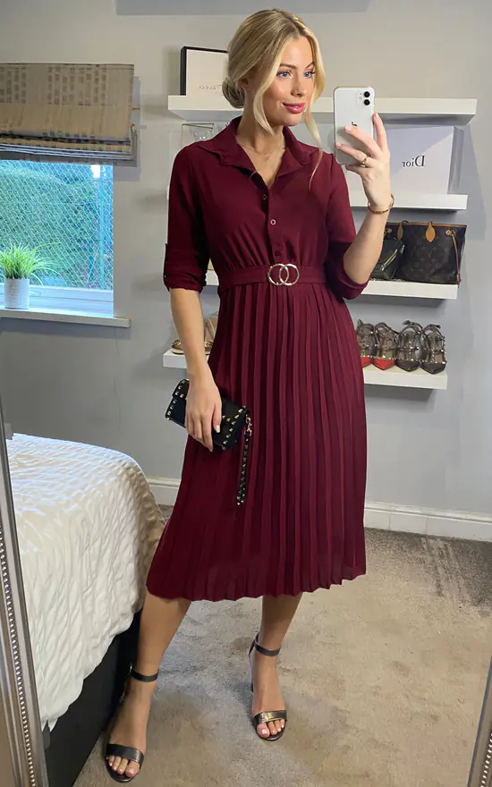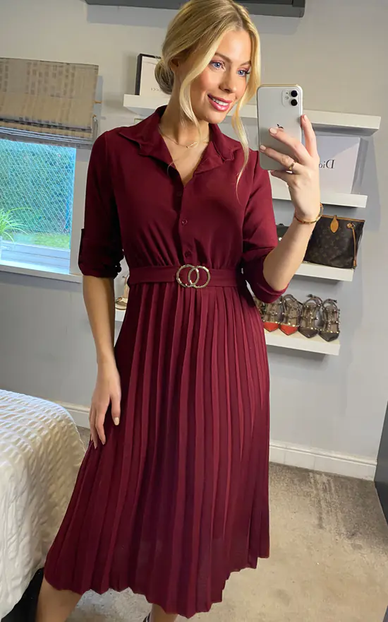 Featuring a classic shirt-dress cut, complete with button through fastening, collar, and waist cinching belt with silver buckle. Match this stunning burgundy fit with ankle boots or strappy heels.