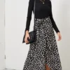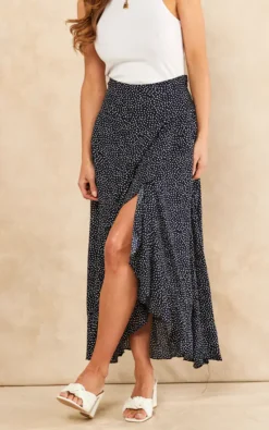 A unique twist on a classic style. This midi wrap skirt in scattered polka dot is a versatile spring/summer item.