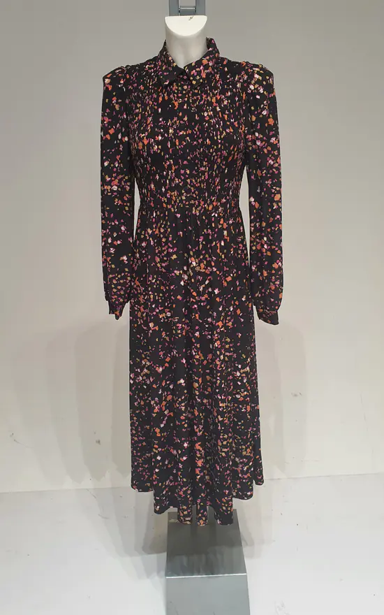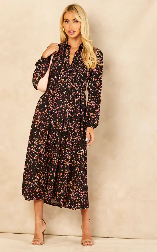 Go from professional woman, to night queen with midi dress. With a shirred bust, button front, puff sleeves and a gorgeous abstract print, elegancy runs through this dress. Ankle strap sandals and a practical mid size bag, are the perfect elements to complete your look.