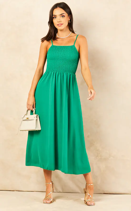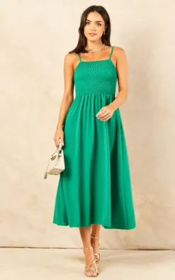 A summer wardrobe staple, understated yet elegant, the Midi Skater Dress features a square neckline, shirred bodice, over the shoulder straps, gathered mid length skirt as well as a pocket detail.