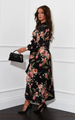 Taking inspiration from the classic English rose, radiate pure elegance in our Thea Black Floral Long Sleeve Wrap Midaxi Dress. Featuring a delicate black based floral, long sleeves with elasticated cuff and wrap over neckline. A subtle feminine frill falls along the wrap over skirt to create a softer look. Pair with black heels to be ready for any occasion this season.