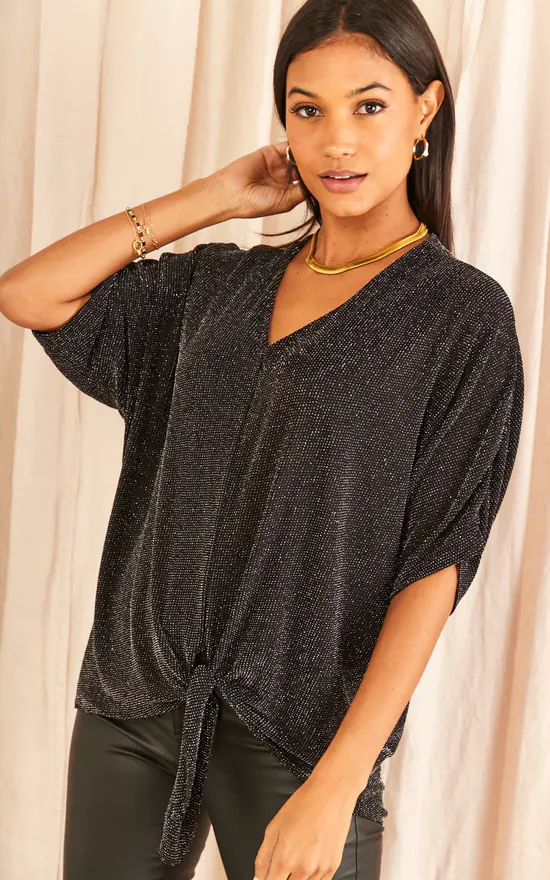 We know how a glistering top can easily make heads turn your way, and that’s exactly why we have this Tie Front Oversized top. Styled with our own Blue Vanilla leggings, go from casual to chick evening girl in no time!