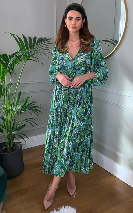 Our best selling Aurora dress is back in this funky green floral print. Effortless shaped it is worked with a V-neck, full length sleeves and cinching elastic waist before falling to a breezy calf-length hem. 100% Polyester.