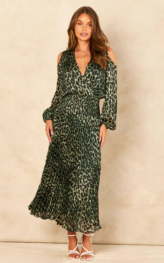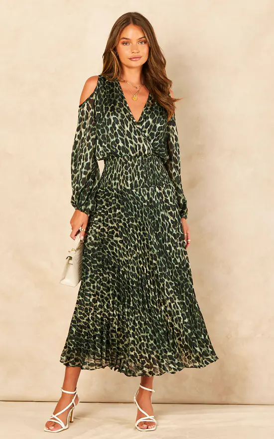 Combining whimsical charm and a playful print, Requiem Dress shows off a soft tailored silhouette. Its sumptuous animal print base is elegantly tailored to feature cold shoulder, v-neckline and a gently flared midi hem and entwined with subtle glitter threads. Machine wash 30c.