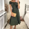 Black Dress with a delicate stand-up collar, flared bottom, ¾ sleeve. It draws attention to the top of the silhouette, emphasizes the waist and optically corrects the proportions of the figure. Perfect for both work and evening outings.