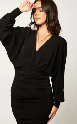 V Neck Long Sleeve Midi drape dress in Black colour. Kimono / Bat style sleeves have very relax fitting. Bottom part of the dress has drape detailing. Made of stretchy Jersey fabric, that makes this dress fitting so comfy and relaxed.