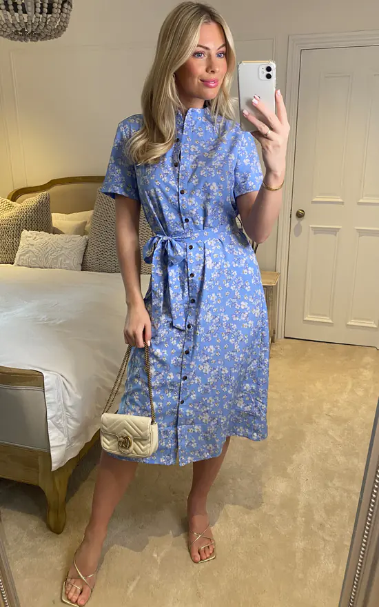 This is the shirt dress everyone wants! The midi dress features a gorgeous white floral print with silky fabric in light blue, standing collar and belt fastening around the waist. Absolutely an essential collection of your seasonal wardrobe. This shirt dress is suitable for all outings, city breaks and parties. Absolute MUST HAVE this season.