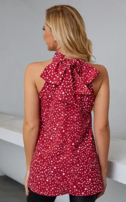 White Star Print Halter Neck Tie Back Top In Red