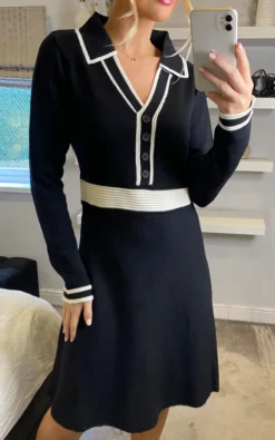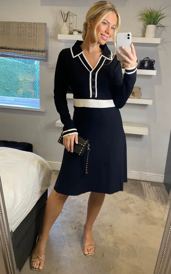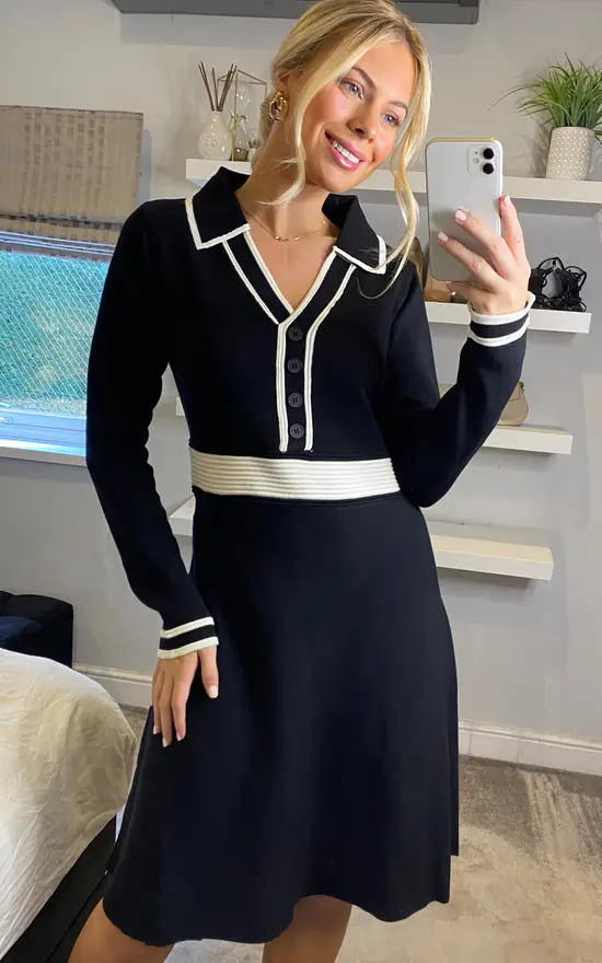 The skater shape, button up collar shape and cinched waist all make this Yumi Black Contrast Collar Knitted Dress a classic fit. In a super soft knit to keep off the chill in the collar months. Style with ankle boots, tights and a blazer to complete the look.